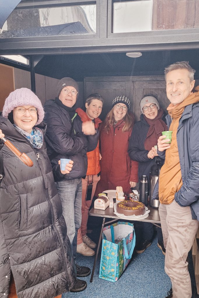 Am 17. Januar 2024 trotzte eine kleine, engagierte Gruppe der eisigen Kälte, um unseren neuen Kreislaufschrank „Au Fein“ am Mariahilfplatz zu feiern. Bei frostigen Temperaturen versammelten sich sechs Personen für die Einweihung mit Kaffee und Kuchen.