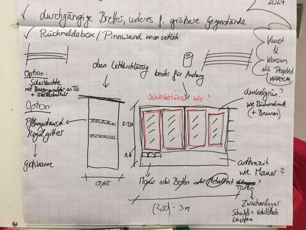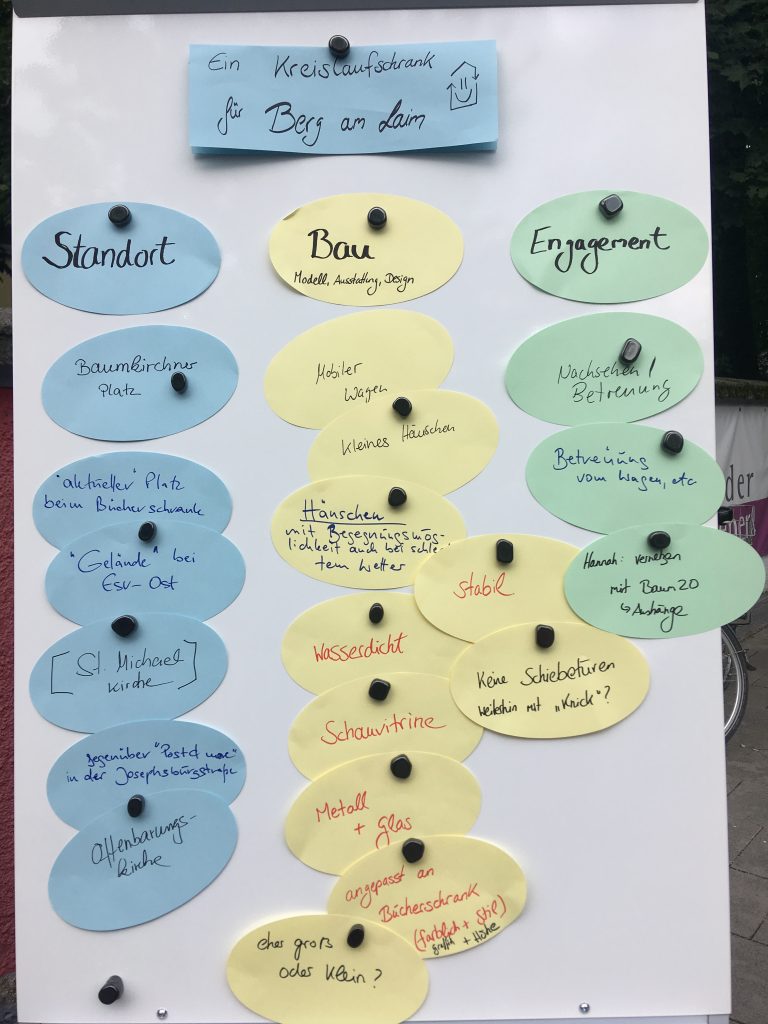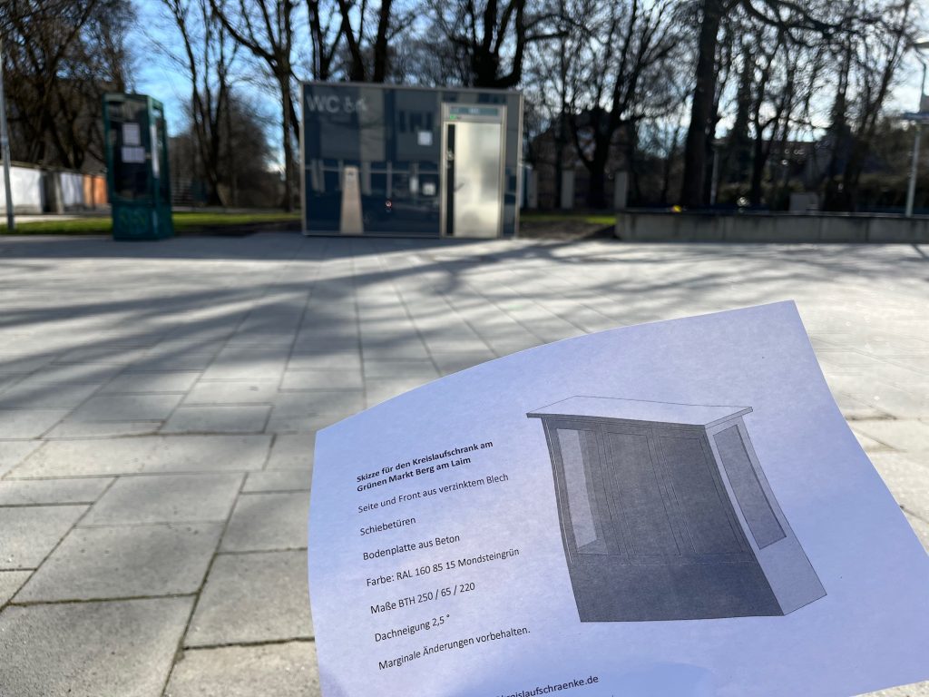 Die ersten Planungen begannen im Rahmen der Klima.DULT vor 1,5 Jahren. Unser mobiles Plausch&TauschMobil EMMA stand 2022 erst einen Tag, dann zwei Wochen, später zwei Monate vor Ort. Die Planung eines festen Standorts war mit viel Elan und Unterstützung aus der Lokalpolitik und der Nachbarschaft erwünscht, aber verzögerte sich immer weiter. Erst stand eine Freischankfläche, dann ein Jahr lang der Toilettenbau dem avisierten Standort im Wege. Schließlich beerdigte der Denkmalschutz den beantragten Platz. Nun gibt es nach einem erneuten Ortstermin mit dem KVR neue Hoffnung! Erratet ihr aus den Fotos, wo der Kreislaufschrank stehen wird? Meldet euch gerne, wenn ihr in der Nähe wohnt und euch neu oder nach wie vor als Pat:in am Kreislaufschrank am Grünen Markt in Berg am Laim engagieren möchtet!