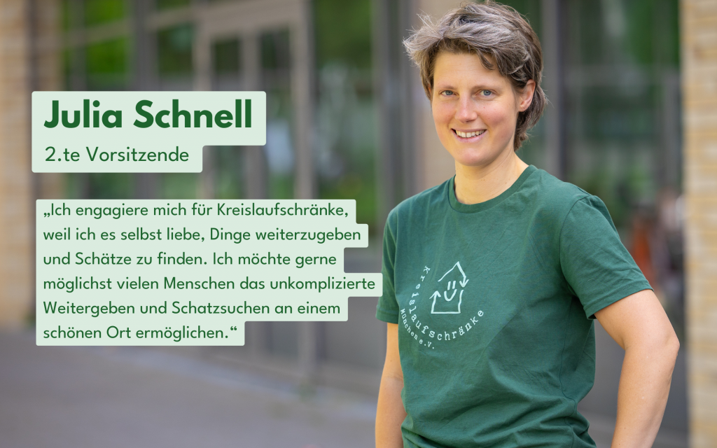 Ihre Begeisterung ist ansteckend. Julia bringt nicht nur Herzblut, sondern auch viele kreative Ideen ein, um die Kreislaufschränke als Anlaufpunkte für nachhaltigen Konsum weiterzuentwickeln.