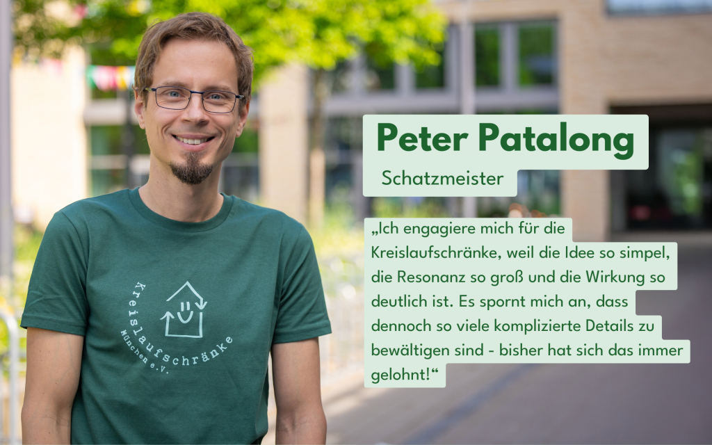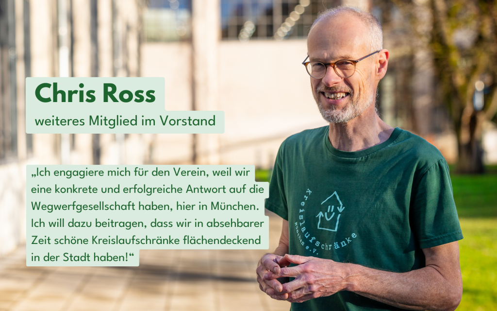 „Ich engagiere mich für den Verein, weil wir eine konkrete und erfolgreiche Antwort auf die Wegwerfgesellschaft haben, hier in München. Ich will dazu beitragen, dass wir in absehbarer Zeit schöne Kreislaufschränke flächendeckend in der Stadt haben!“